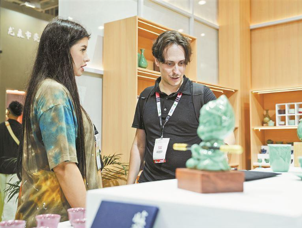 Pictured are attendees perusing tea sets and artisanal crafts.
