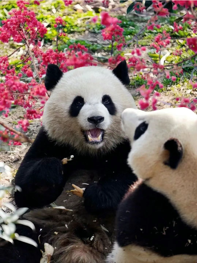 At Chengdu Research Base of Giant Panda Breeding, cubs tumbling in the woods and giant pandas basking in the sunshine on climbing frames are sharing their festive joy in their own way.