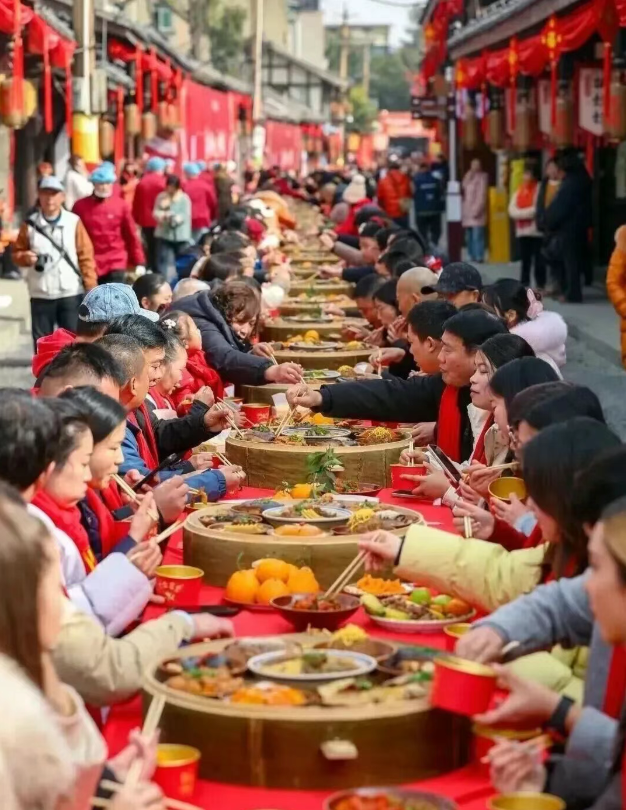 On February 7, 2026, a long-table banquet will be held at Chengxiang Ancient City, Qingbaijiang District, Chengdu, amid festive lanterns and decorations. Stretching over 300 meters in length, West Street, where the banquet will be held, is the best-preserved ancient street in Chengxiang Ancient City.