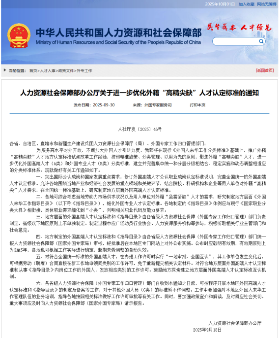 The Office of the Ministry of Human Resources and Social Security issued a notice on September 30, requiring further optimization of the criteria for identifying "highly skilled, specialized, and critical" foreign talents: