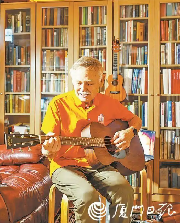 Brown performing his original song "A Xiamener from Afar" at his home in the Xiamen University staff residential quarter