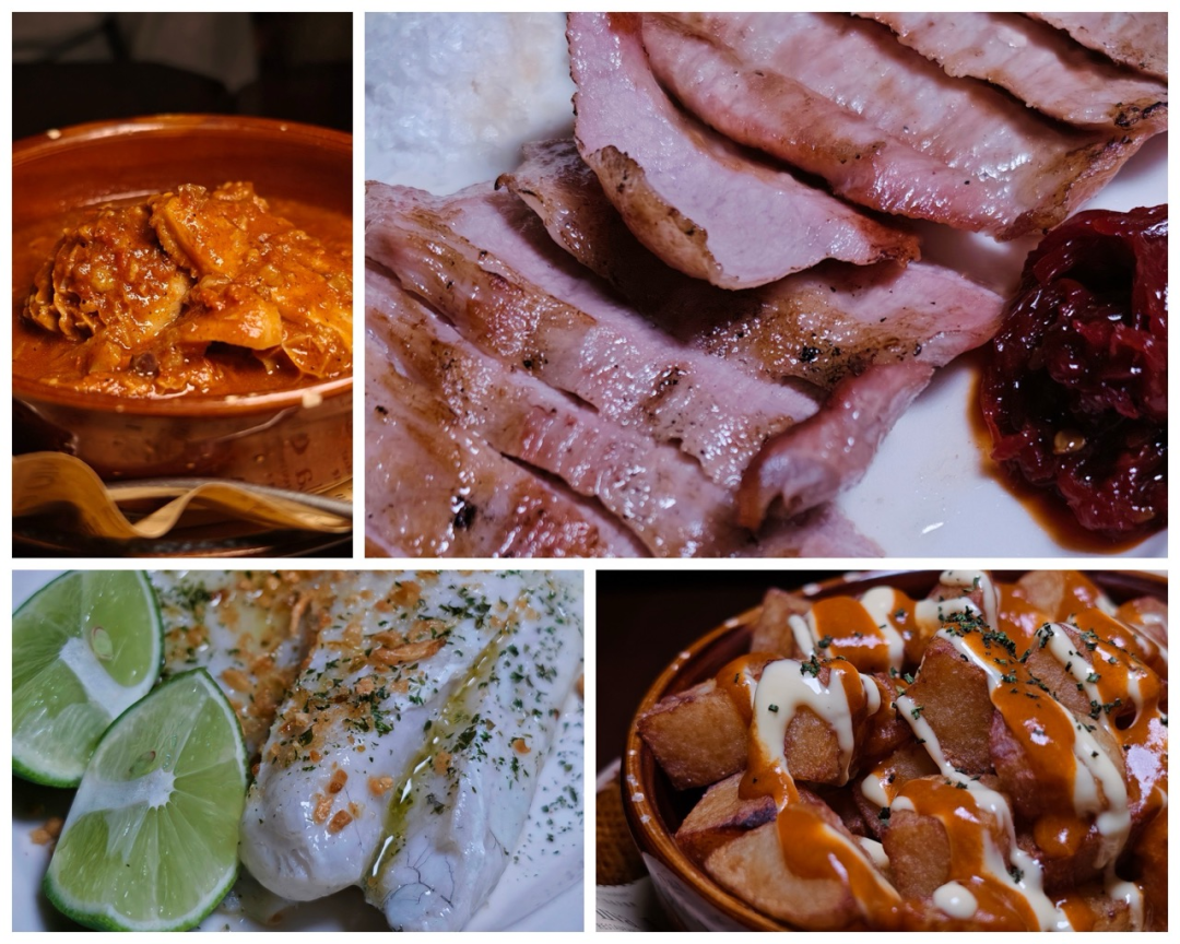 Top Left: Madrid-style tripe stew, Top Right: Imported Spanish Iberian Pork skirt charcoal-grilled with candied piquillo peppers & sea salt flakes, Bottom Left: Charcoal-grilled seabass fillet with crispy garlic, extra virgin olive oil, Bottom Right: Patatas bravas with two sauces: homemade brava, roasted garlic aioli.