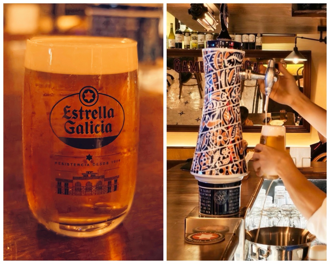 Estrella Galicia beer, poured via a horizontal tap for ultimate control.