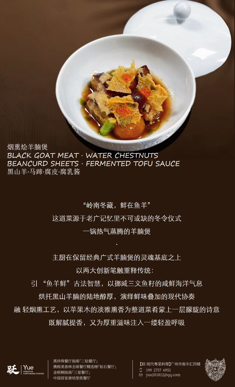 YUE Creative Cantonese Cuisine reimagines the classic Lingnan winter ritual with a bold, poetic twist. Chef Seven blends tradition and innovation—pairing rich black goat with Norwegian salmon roe for layered umami, and finishing with a gentle applewood smoke aroma. This seasonal dish honors the wisdom of 'fish and goat for delicate flavor', offering warmth, depth, and a breath of lightness. Recommended pairing: Champagne with bright acidity and fine bubbles to balance the richness.