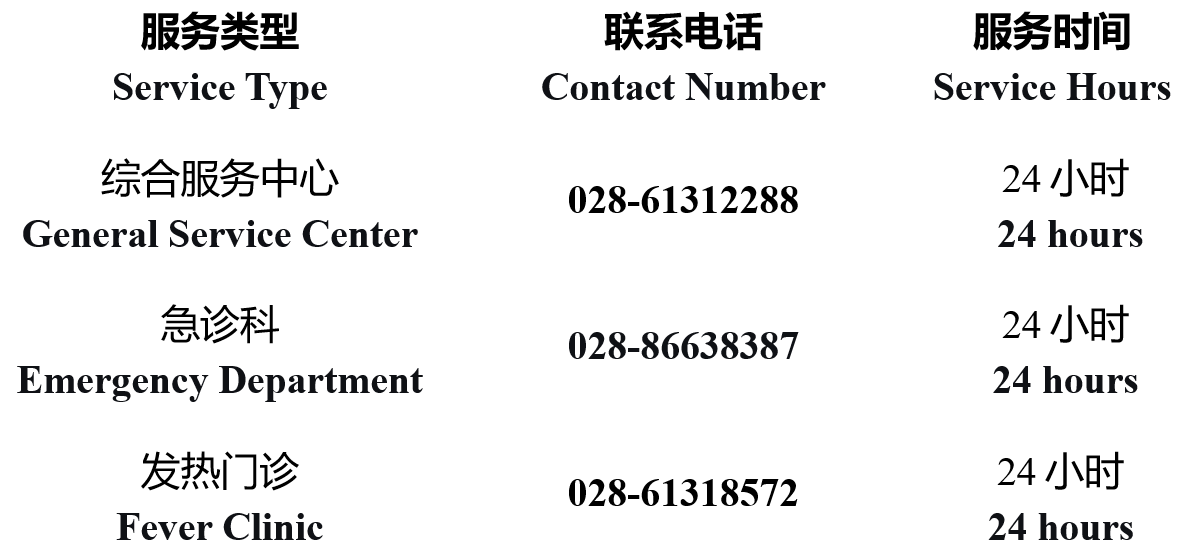 Note: For inquiries about appointment booking, medical procedures, hospital layout, and more, please contact the General Service Center at 028-61312288. Services are available in both Chinese and English.