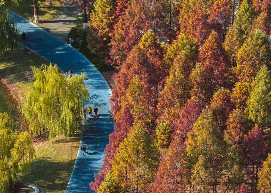 Photo taken on Dec. 3, 2025 shows the view of red leaves at the Changqing Park in Wuhan, Hubei Province. The park has ushered in the best time of the year to view red leaves and which is expected to last until mid-December. ...
