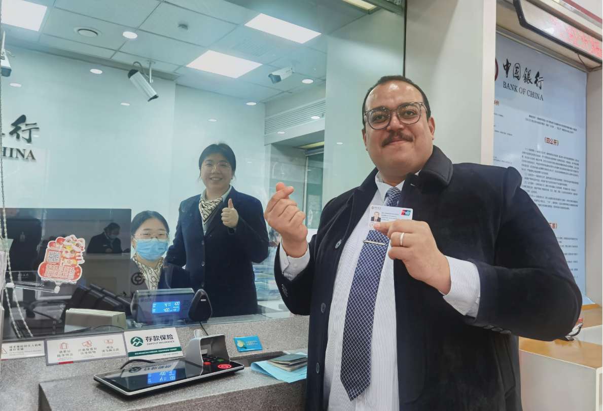 On February 21, Mohamed Frahat Foda, an associate professor at Huazhong Agricultural University from Egypt, successfully received Hubei Province's first social security card integrating foreigner work permit information at the Bank of China Wuhan East Lake Huanong Sub-branch.