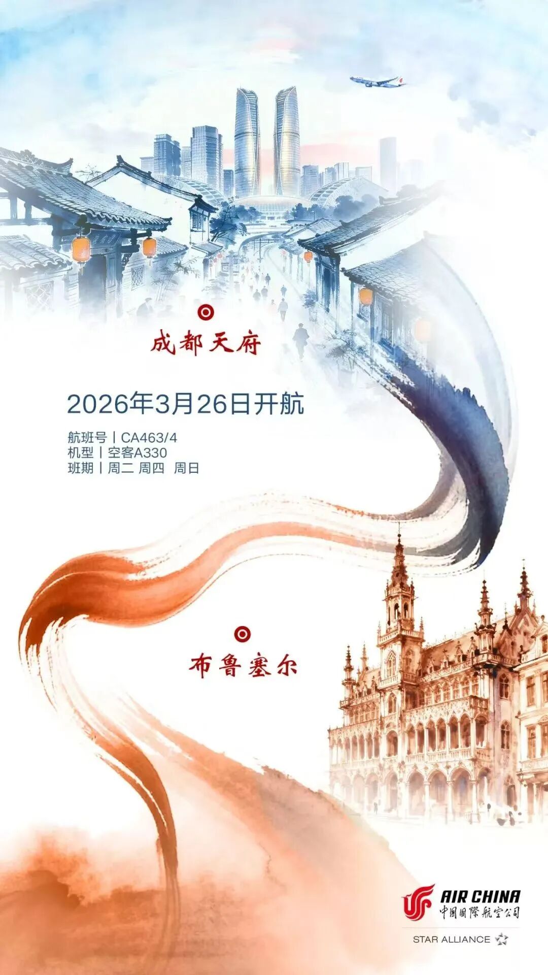 Flights will operate three times a week on Tuesdays, Thursdays, and Sundays with an Airbus A330-300 aircraft. The outbound flight CA463 is scheduled to depart from Chengdu Tianfu International Airport at 02:30 and arrive at Brussels Airport at 06:20 local time. The return flight CA464 is scheduled to depart from Brussels Airport at 12:30 local time and arrive at Chengdu Tianfu International Airport at 05:55 the following day.