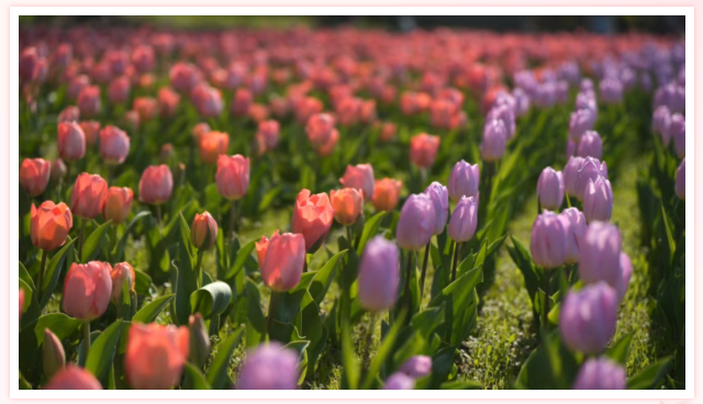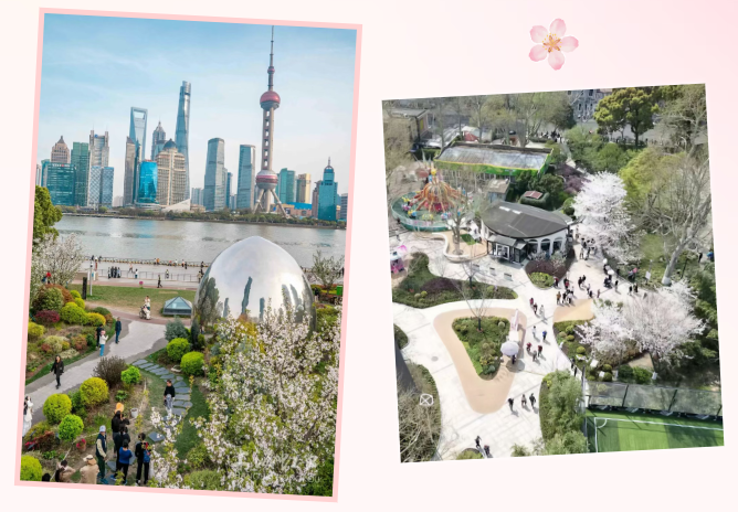 Walk into Jing'an Sculpture Park, where the last Kanzakura cherry blossoms linger as tulips take center stage in full bloom. Bands of red, orange, pink, and purple stretch across the park. In early April, crabapple and peach blossoms also begin to add soft shades of pink and crimson to the scene.