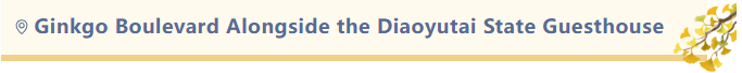 From early to mid-November each year, the ginkgo boulevard along the east wall of the Diaoyutai State Guesthouse enters its most beautiful season. The ginkgo trees lining the long street transition from deep green to brilliant gold, resembling amber glowing in sunlight.