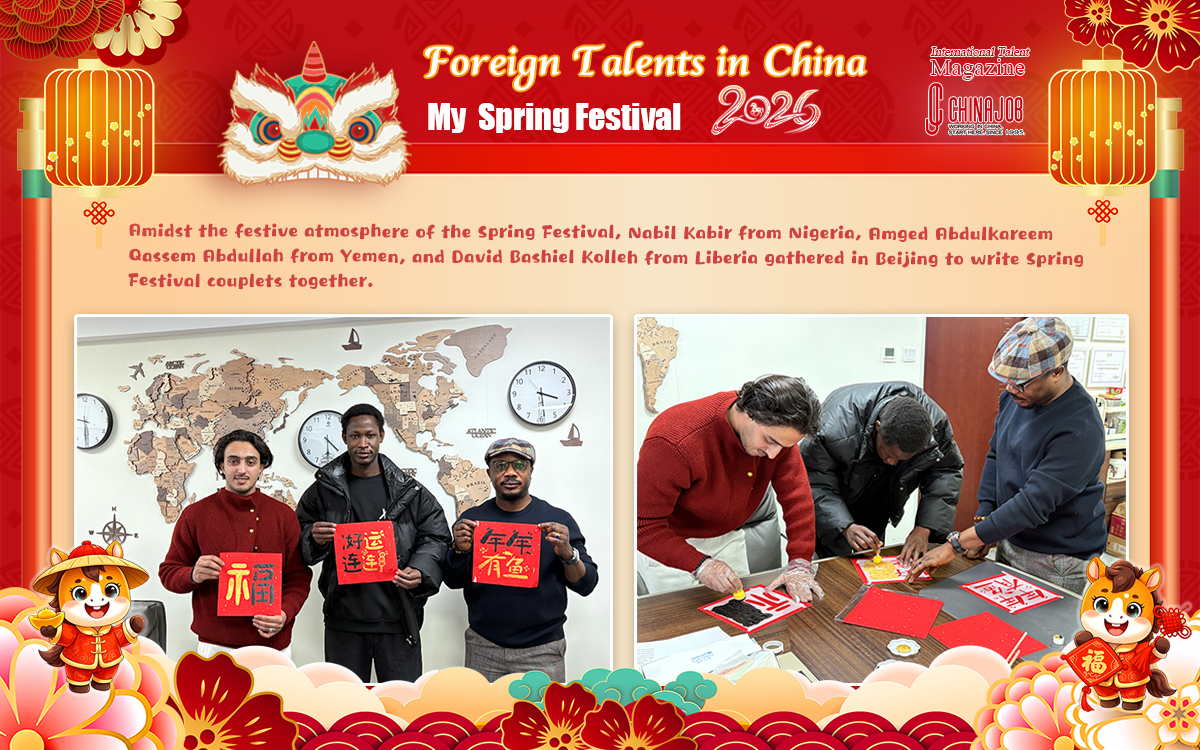 Amidst the festive atmosphere of the Spring Festival, Nabil Kabir from Nigeria, Amged Abdulkareem Qassem Abdullah from Yemen, and David Bashiel Kolleh from Liberia gathered in Beijing to write Spring Festival couplets together.