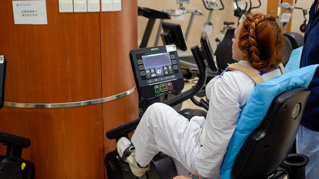 Irina Karabulatova undergoes rehabilitation training on an exercise machine at The University of Hong Kong–Shenzhen Hospital as part of her recovery after the spinal surgery.