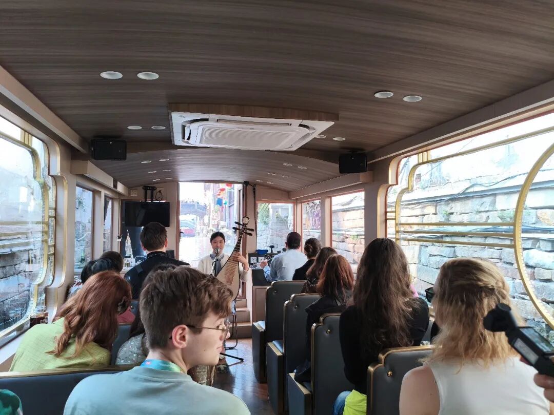 In the afternoon, the group ascended Changmen Gate, overlooking Suzhou's "double-sided embroidery" urban landscape, where ancient charm and modernity intertwine. From the city wall, Lara marveled at the view and remarked, "Seeing Chinese history here is interesting and it is beautiful. l think the architecture is really gorgeous." Emma also tasted the Changmen Gate-themed ice cream on-site. "It has a unique flavor. I never tasted something like that," she said.Next, they took a pleasure boat trip along Shantang River, immersing themselves in the melodies of Pingtan and the culture of the ancient canal. Daniel exclaimed, "I find it kind of fun to have a boat trip. I am enjoying it very much."