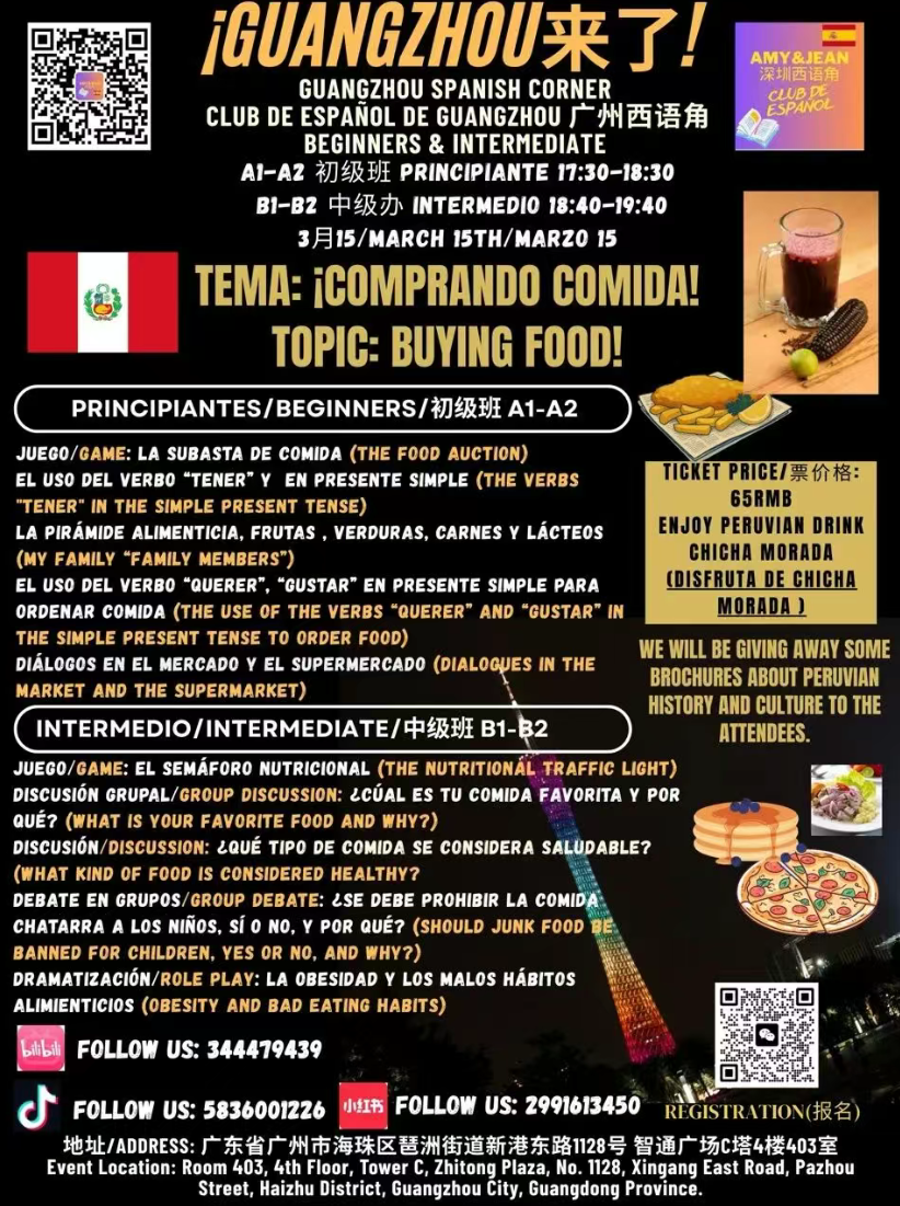 Spanish language enthusiasts gather for another session of Guangzhou’s Spanish Corner, organized by Amy & Jean’s Club de Español. Designed for both beginners and intermediate learners, the interactive session blends conversation practice with games, vocabulary building, and group discussions. This edition centers on the theme ‘Buying Food,’ guiding participants through everyday scenarios such as ordering meals, shopping in markets, and discussing food preferences in Spanish. Activities range from role-play and language games to guided discussions, creating a relaxed environment to practice speaking while meeting others interested in Spanish language and culture.
