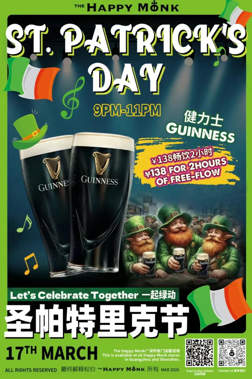 Guinness, green outfits, and a festive Irish spirit take over The Happy Monk this St. Patrick’s Day. The popular pub chain is marking the occasion with a exciting night centered around the iconic Irish stout, inviting guests to raise a pint and join the celebration. Expect a cheerful crowd, music, and plenty of good energy as the evening turns into a Guinness-fueled gathering across the bar’s Guangzhou and Shenzhen locations. Put on something green, gather a few friends, and settle in for an Irish-style night where dark pints, laughter, and lively pub vibes flow freely.