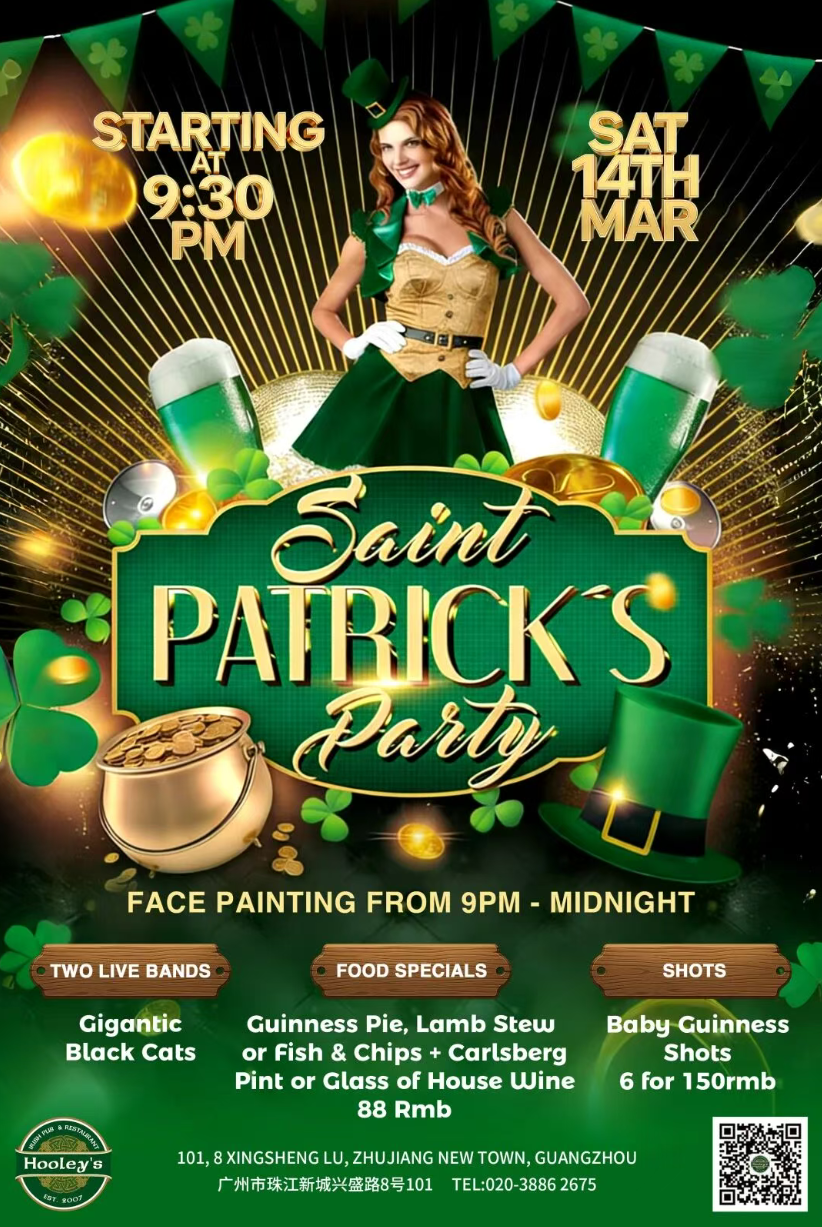 Guangzhou’s long-running Irish pub Hooley’s is bringing the St. Patrick’s spirit to Zhujiang New Town with a festive night of live music, hearty pub classics, and plenty of Irish cheer. The celebration features two live bands taking the stage to keep the energy high, while themed food specials and Guinness-inspired shots add to the party atmosphere. Expect green decorations, vibrant crowds, and a classic Irish pub vibe that turns the night into a full St. Patrick’s gathering. Put on something green, grab a pint, and join the music-filled celebration.