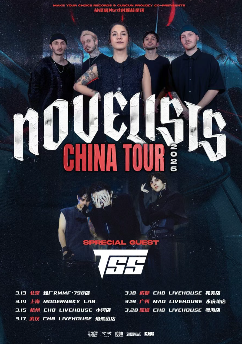 French progressive metal heavyweights Novelists return to China this March, bringing their latest album CODA and a sharper, more melodic evolution to the Guangzhou stage. Marking the band’s fifth studio release, and the first with vocalist Camille, CODA leans deeper into layered arrangements and soaring hooks without losing its technical bite. Camille’s dynamic vocal range, shifting from crystalline melodies to raw, forceful screams, adds a new dimension to the band’s sound, while Pierre and Flo’s intricate guitar work anchors the transformation. Joining them as special guests are rising French nu-metal newcomers TSS (The Sunday Sadness), whose gothic aesthetic and emotionally charged sound have quickly built an international following. After turning heads at major Chinese festivals last year, they return ready to push the intensity even further. Expect a tighter production, bigger sound, and a night built for the pit.