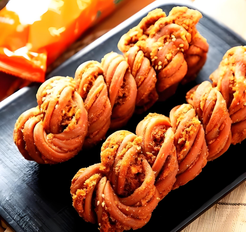 After years of refining the recipe, Guifaxiang developed a unique version that layers crisp fillings—such as sweet-scented osmanthus, ginger, peach kernels, and candied melon—between white flour strands and sesame strands. This technique gives the finished twist a rich texture: crisp on the outside, subtly sweet and aromatic on the inside. One of the defining features of Tianjin Mahua is its long shelf life. Even after being stored in a dry, well-ventilated space for several months, it retains its signature flavor and crispness without becoming soft or stale.