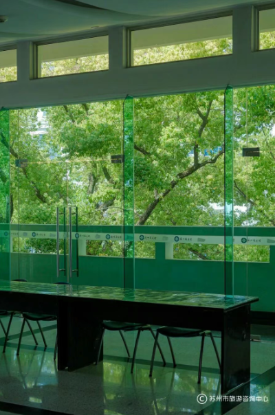 The third-floor lecture hall in the Southern Wing of Suzhou Library has replaced its monotonous white walls with floor-to-ceiling glass windows. Unobstructed by any external structures, the view frames only two century-old camphor trees with sprawling branches against a backdrop of greenery and sky.