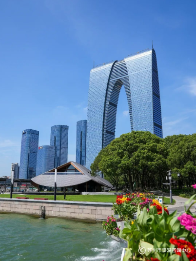 As one of Suzhou's iconic landmarks, the Gate of the Orient blends traditional motifs with modern architecture through sleek geometric curves, carrying forward the history and culture of Suzhou. Its glass facade mirrors hues of the blue sky and the lake.