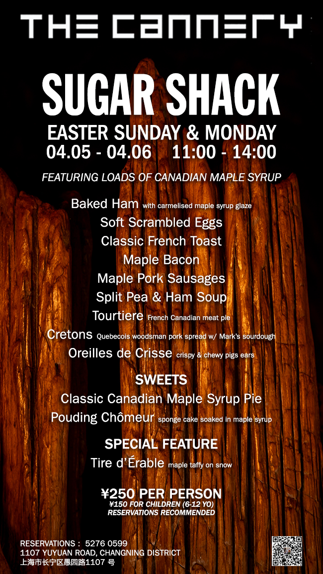 Priced at RMB250 for adults or RMB150 for children ages 6–12, the menu includes maple-glazed ham, soft scrambled eggs, French toast, maple bacon, sausages, split pea soup, meat pie, pork spread, and pig ears.