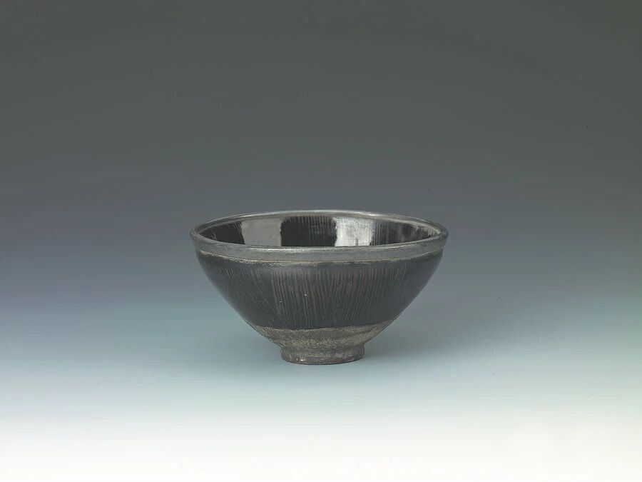 A black lacquer tea bowl, its interior subtly decorated with hair-thin, intermittently shimmering gold lines to evoke the famed "hare's-fur" porcelain. [Photo provided to China Daily]