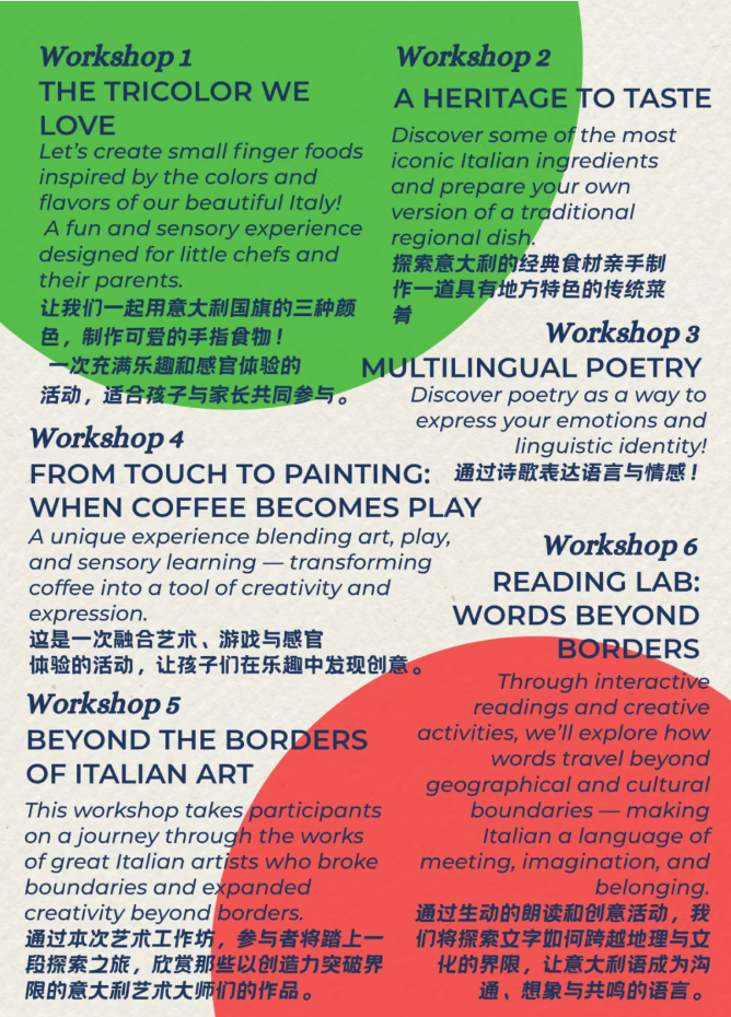 That will be followed by a selection of interactive workshops—your chance to immerse yourself in Italian culture.