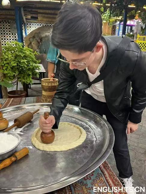 Alexander Wirch learns to make naan at Xinjiang International Grand Bazaar in Urumqi, northwest China's Xinjiang Uygur Autonomous Region.