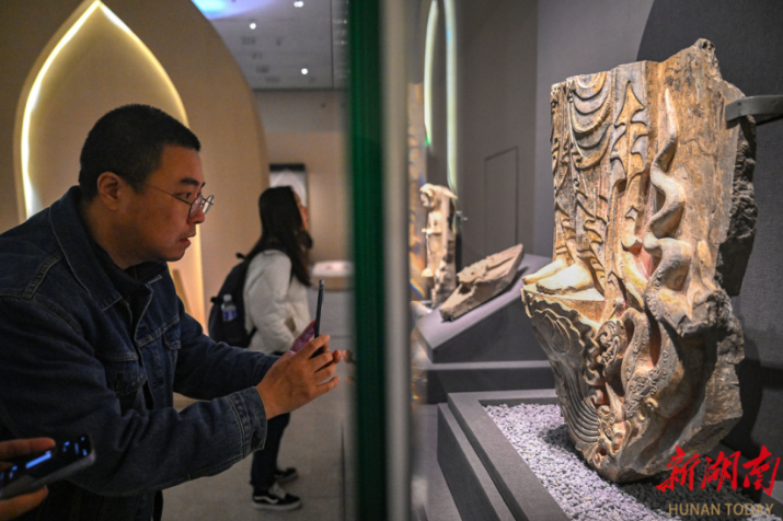 Visitors view Qingzhou-style Buddha statues on display at the Hunan Museum. (Photo/Guo Liliang, Hunan Daily)