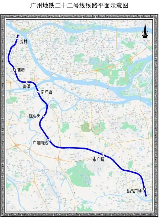 Line 22 has a total length of 29.7 kilometers and comprises eight stations, including four interchange stations. Designed as an express line to Guangzhou South Railway Station, the line operates at a maximum speed of 160 km/h. The initial section of Line 22 (Panyu Square–Chentougang) has been in service since March 31, 2022, while the latter section (Chentougang–Fangcun) is scheduled to open within the year.