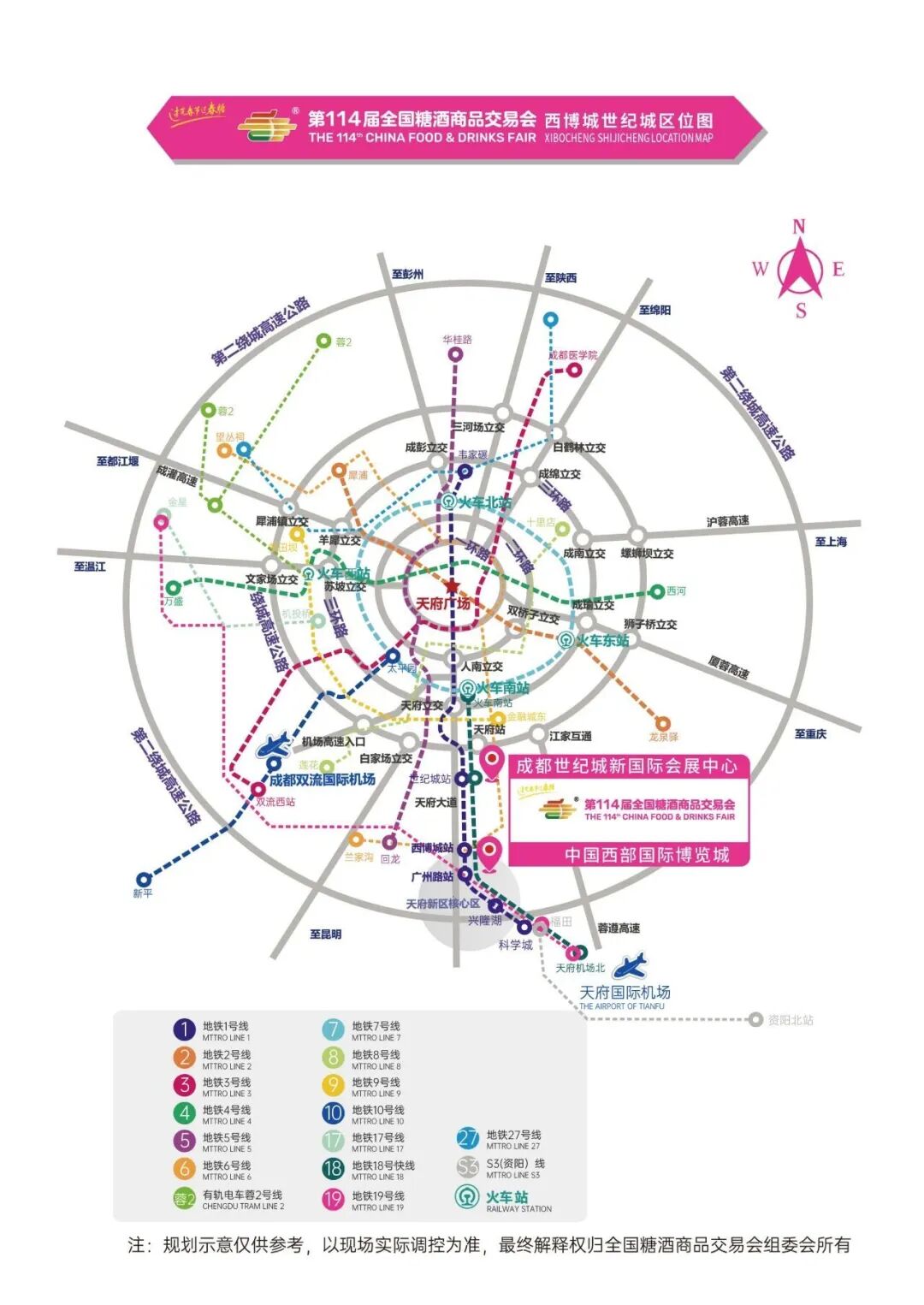 Metro: Visitors may walk to South Railway Station, take Line 18 to Western China Int’l Expo City Station, and use Exits C or E to enter the venue.