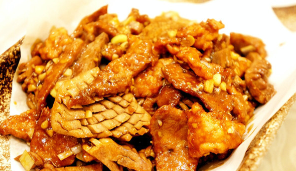 After processing, the three ingredients are coated with starch, with a pinch of salt added to the tenderloin. After a few minutes, oil is poured into a wok to begin cooking. To achieve a tender and smooth texture, it is essential to use plenty of oil at a moderate temperature. The three ingredients are added in the following order: pork tenderloin, pork kidney, and pork liver. Once the surfaces change color, they are immediately removed to prevent overcooking and toughness. Then, a sauce is prepared using ingredients such as water, sugar, white pepper, cooking wine, and minced scallion, ginger, and garlic.