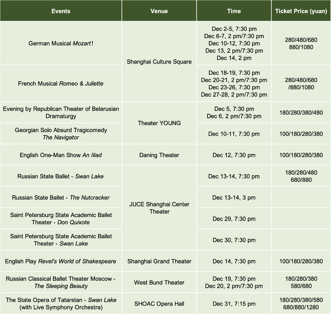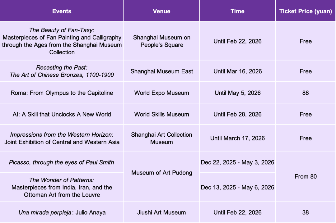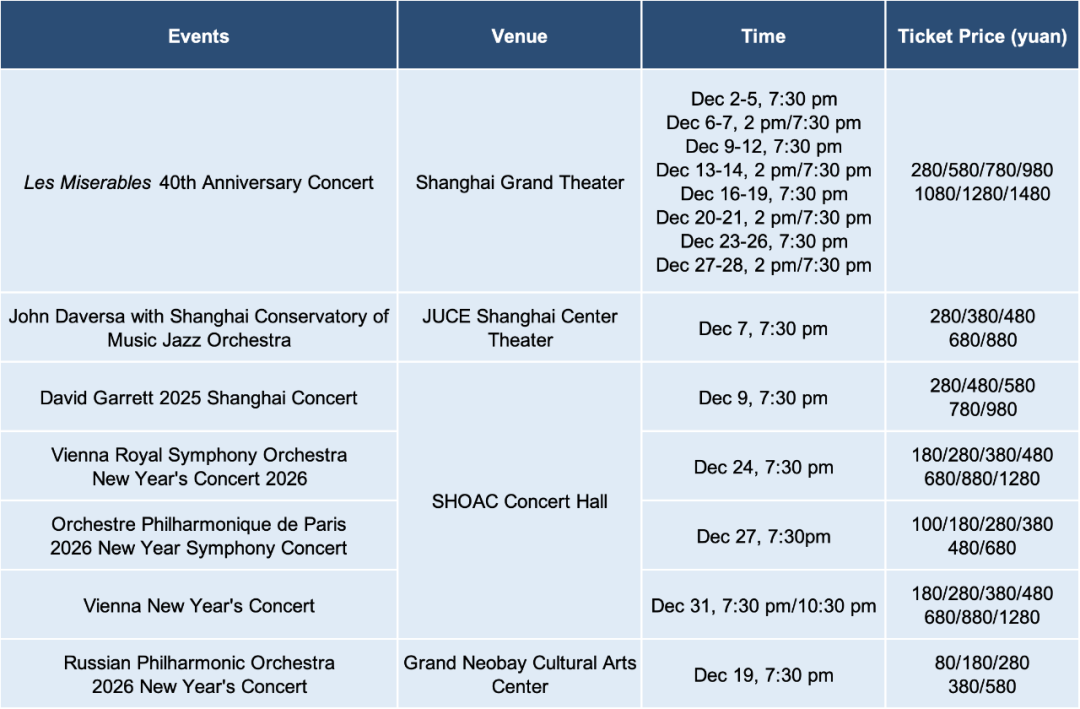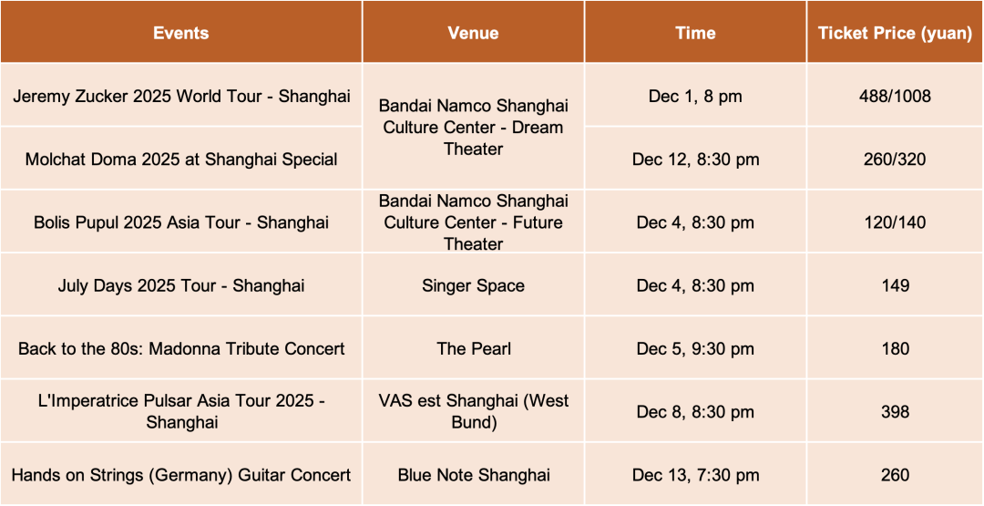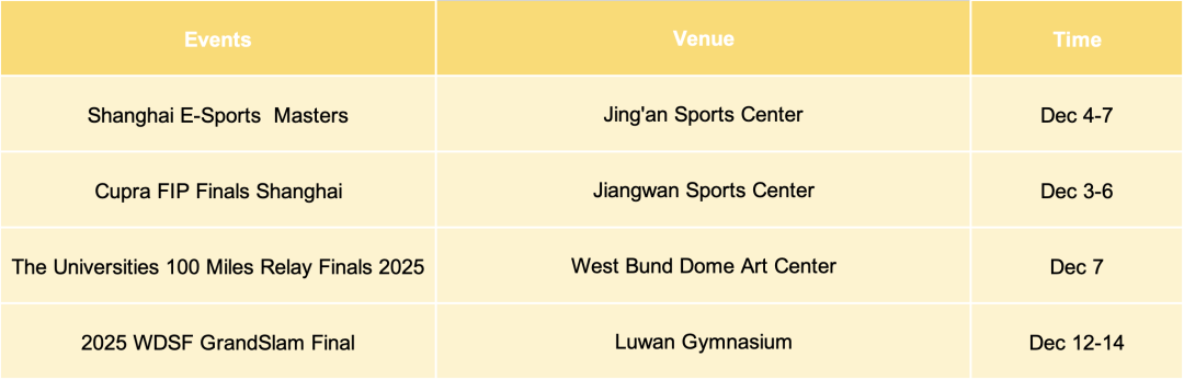 Sources: Shanghai Administration of Culture and Tourism, Shanghai Administration of Sports, official sporting events/performances/exhibitions/livehouse mentioned above