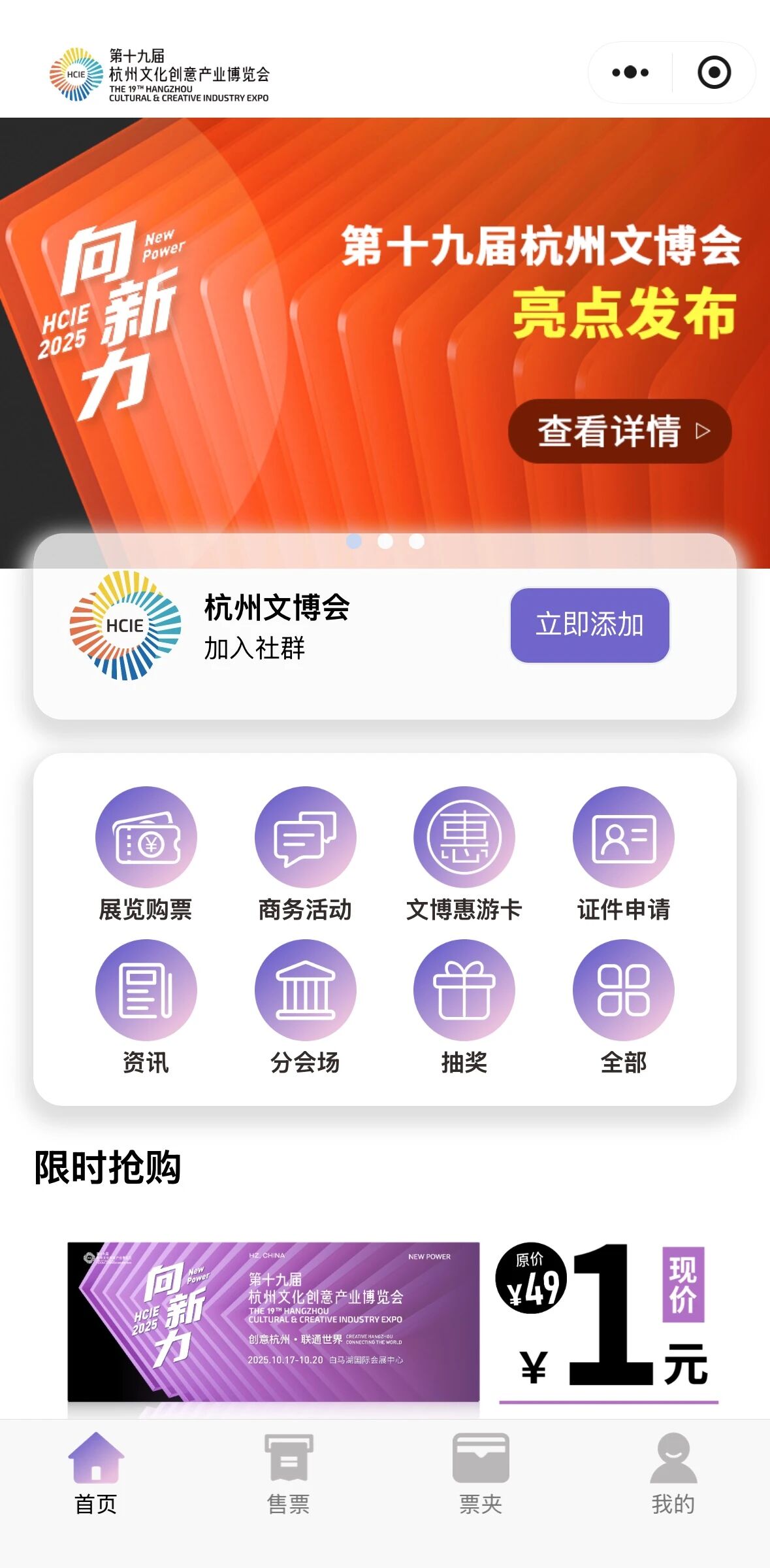 1. Search for “杭州文博会” on WeChat or scan the QR code and enter the mini program.