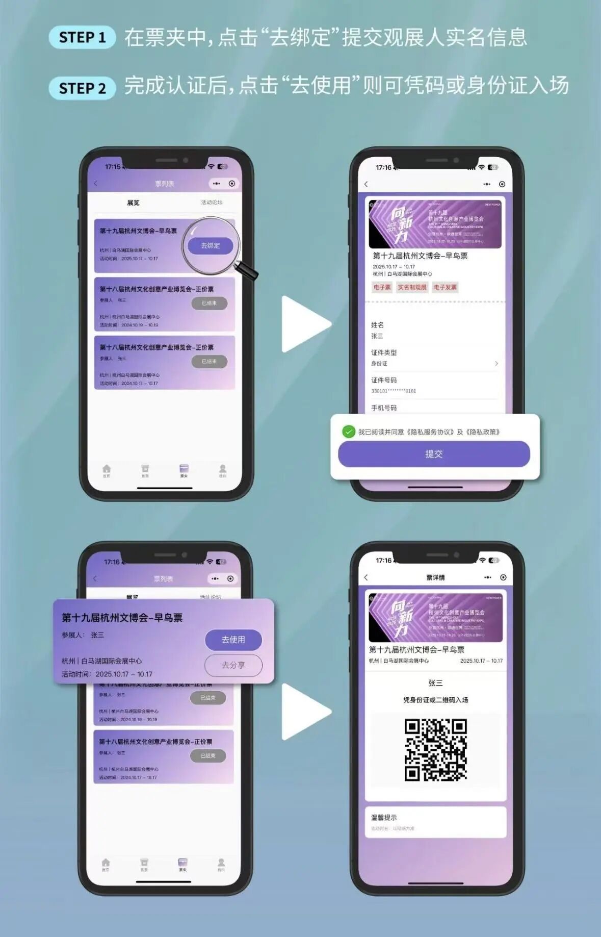 2. After verification, click “去使用 (Use)” to enter the venue with either the QR code or your ID card/passport.