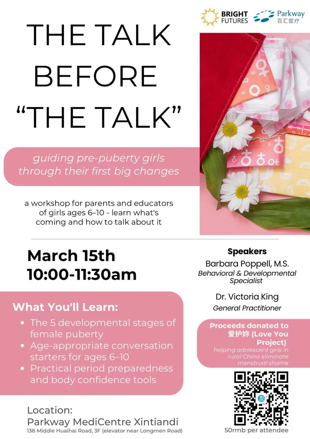 Behavioral specialist Barbara Poppell and general practitioner Dr. Victoria King will cover the five developmental stages of female puberty, offer age-appropriate conversation starters, and share strategies for building period preparedness and body confidence.