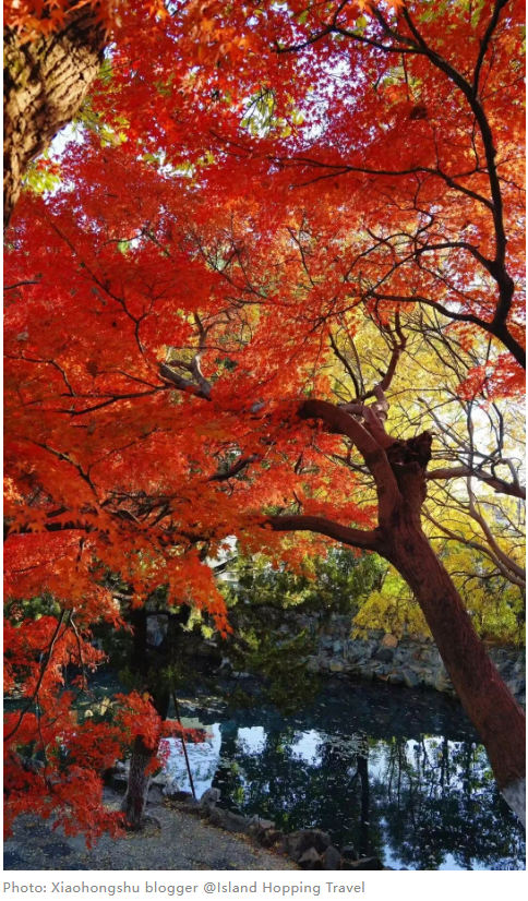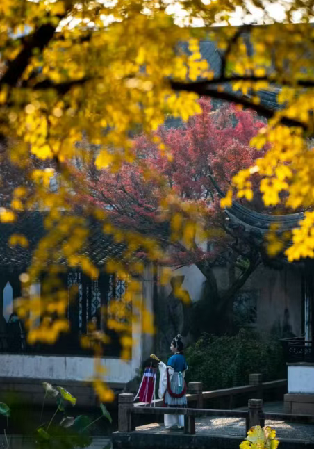 Before entering the Tiger Hill Scenic Area, visitors are attracted by two rows of ginkgo trees at the South Gate. After capturing the ginkgo's splendor, hurry to glimpse the fiery maples outside Yongcui Villa. Then, step into Yixieyuan, where emerald waters and winding bridges add to the autumn's most beautiful hues.