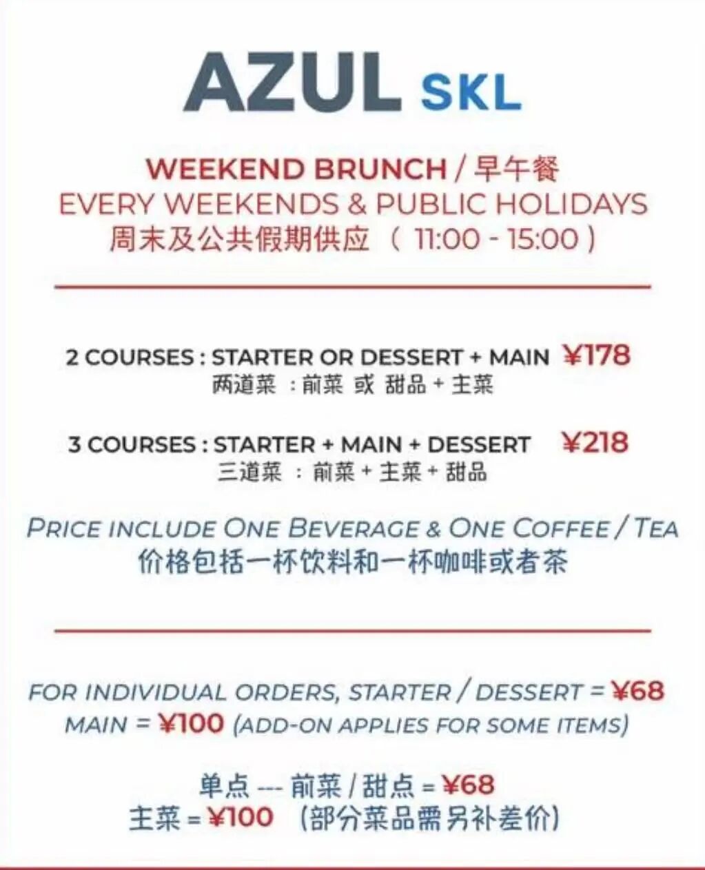 Brunch is RMB188, which includes one dish and two drinks. And you can enjoy three hours free flow beer and soft drinks for RMB188 or Prosecco, wine, mimosas, and Aperol Spritz for RMB268.