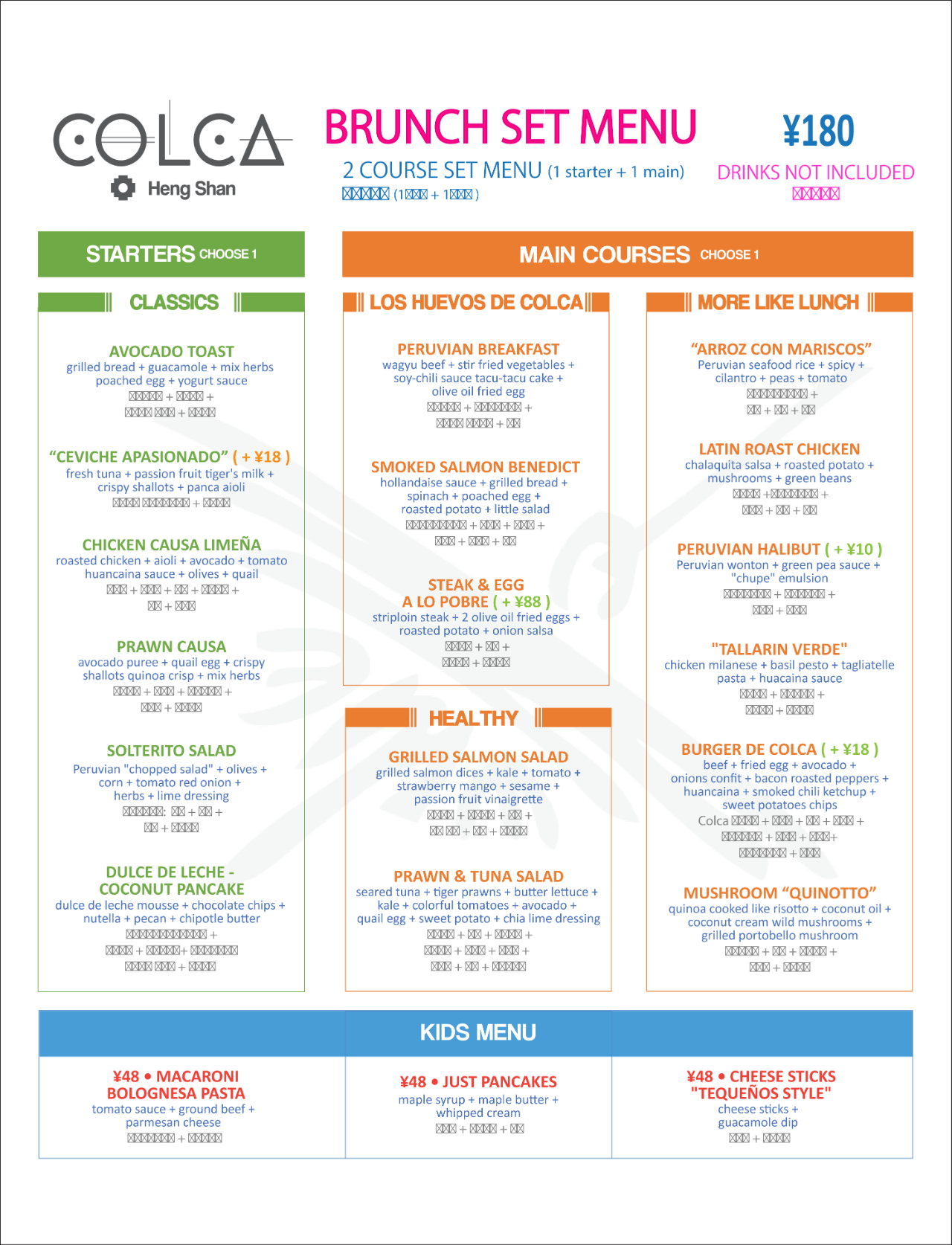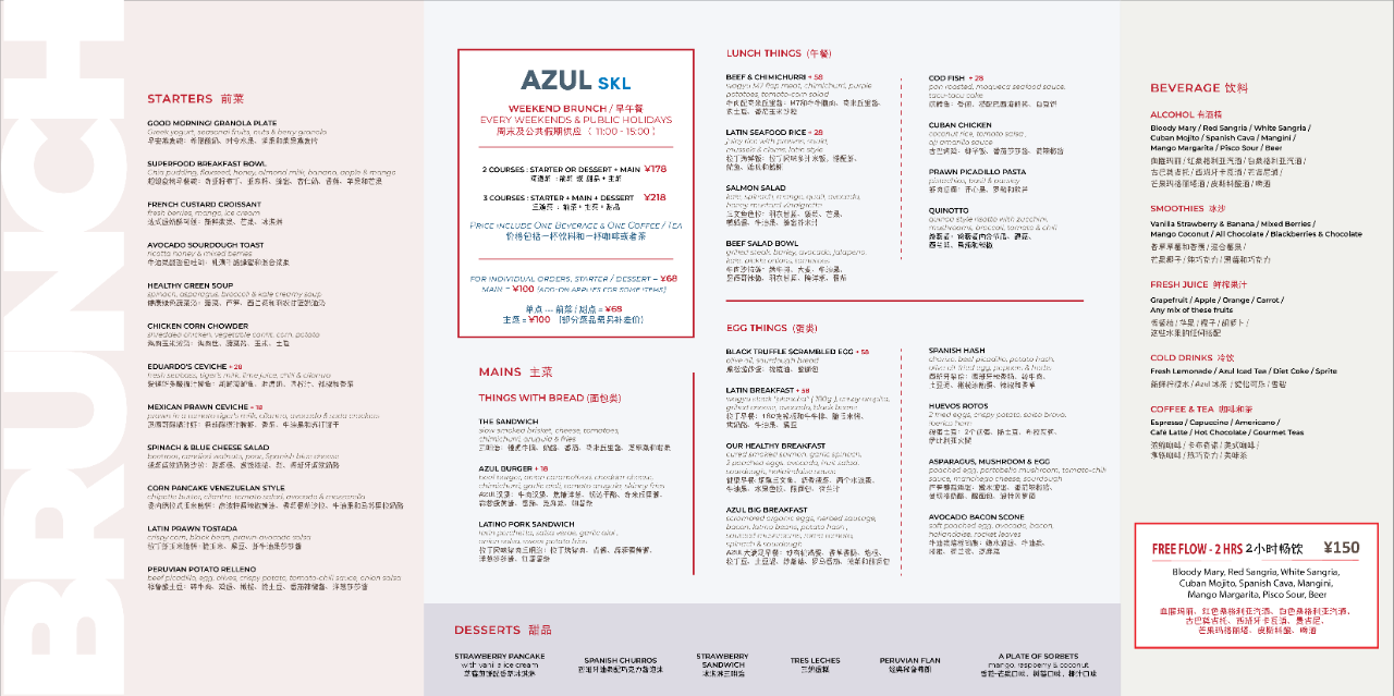 Over at Azul Group's Colca, it is RMB180 for two courses (starter and main), with a two-hour free flow deal at just RMB150—see the full menu above.