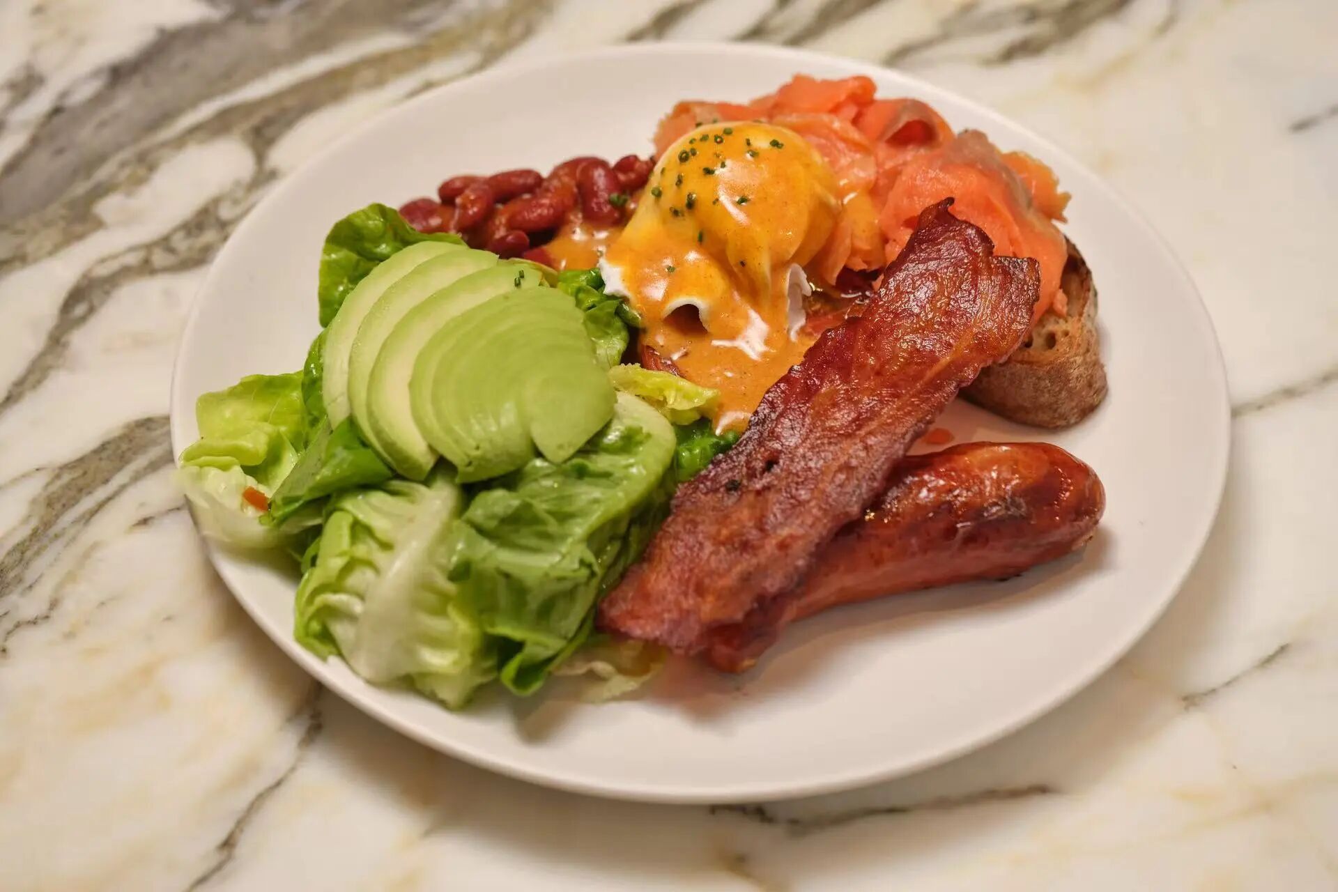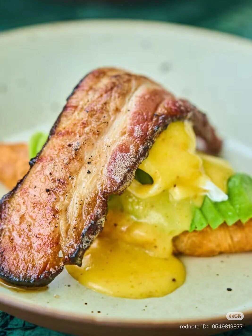 Poached eggs with Grilled Avocado, House-made Bacon on a Crispy Puff Pastry drizzled with House Made Hollandaise