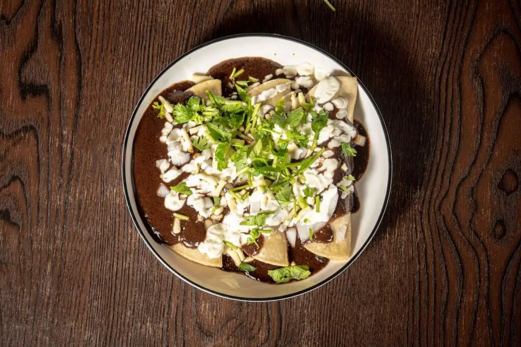 Brisket Mole Chilaquiles – Crispy tortillas topped with smoked brisket, farm-fresh eggs, and a generous drizzle of mole