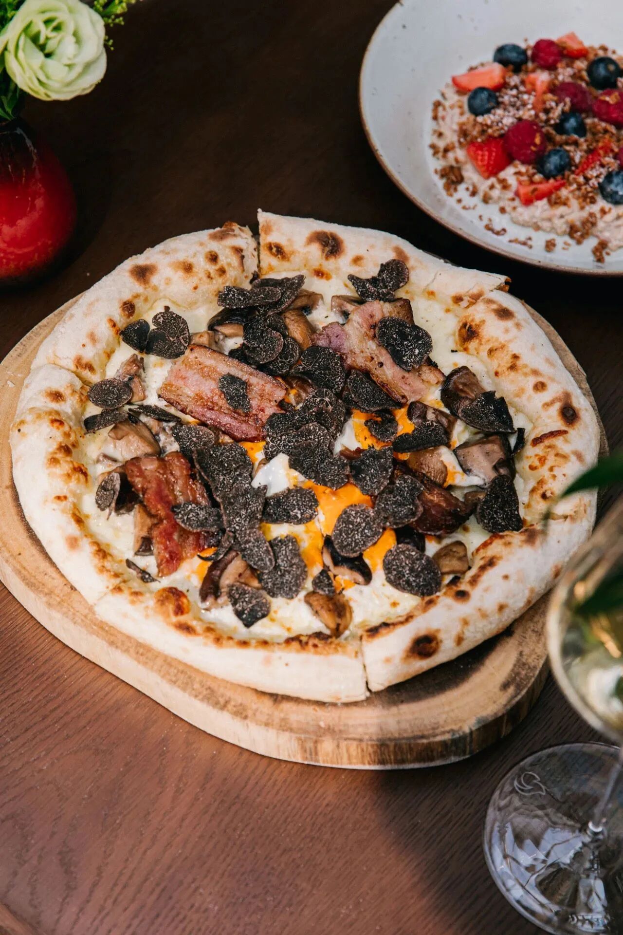 Breakfast Pizza: Black Truffle, Brie Cheese, Mushroom, Bacon, Egg & Mozzarella