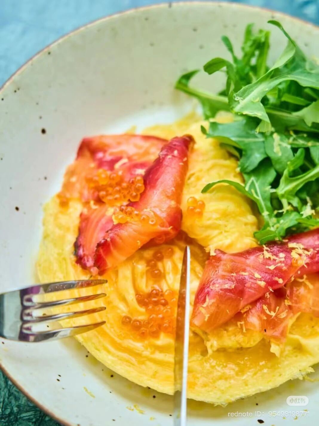 Salmon Scrambled Eggs with Lemon Zest, Salmon Roe & Rocket