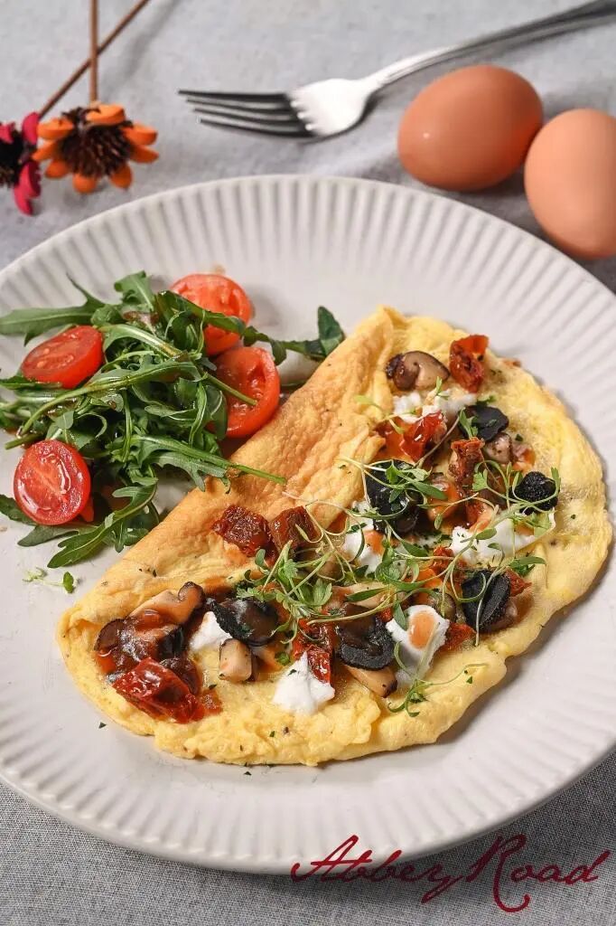 Good Day Sunshine Omelet (RMB62): Truffle Omelet, Mushrooms, Burrata Cheese, Sun-dried Tomatoes, Arugula Salad