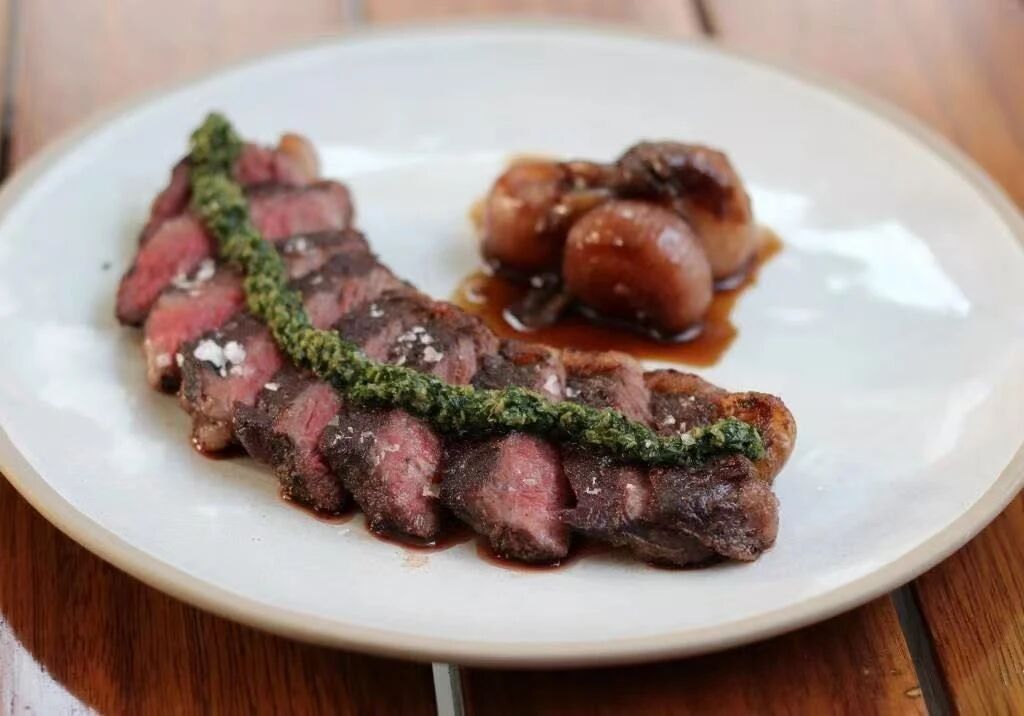 Pan-Roast Rump Cap (RMB128/250g, RMB148/300g): Beef Rump, Baby Onions, Salsa Verde. Photo by Jimmy Jordan / That’s