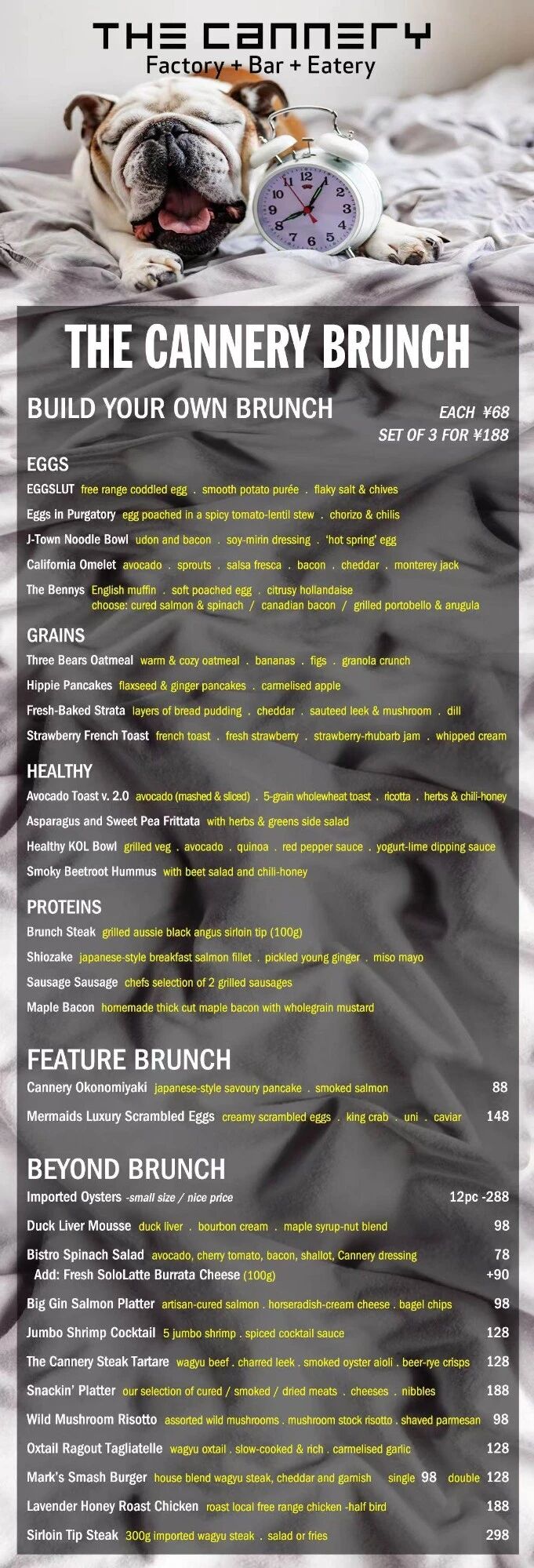 The Cannery brunch menu is a 'build your own' affair with dishes RMB68 each or RMB188 for three. There is also a RMB198 free flow deal, as well as a special brunch drinks menu full of tasty concoctions.