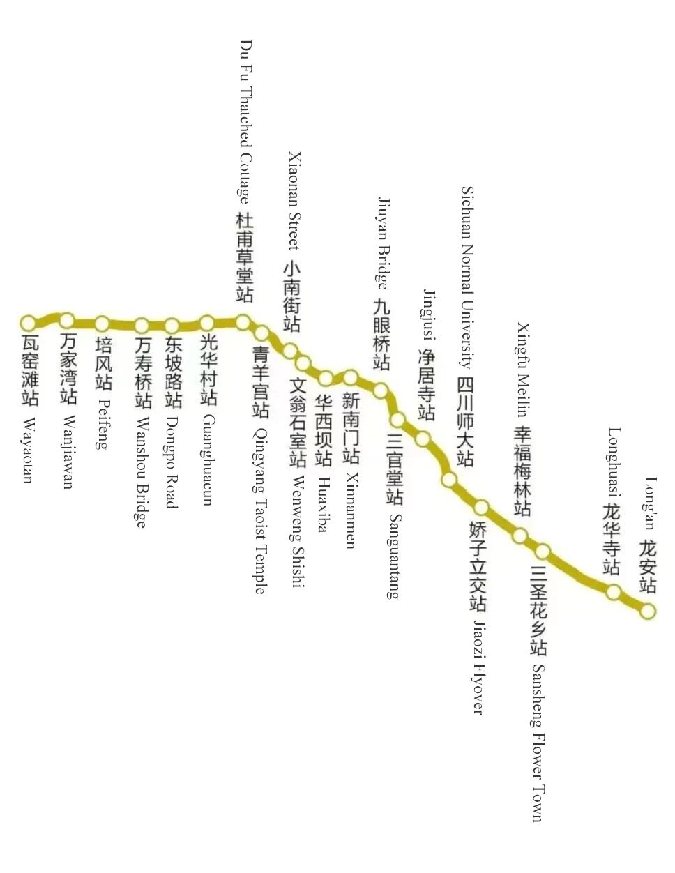 Line 13 Phase 1 stretches 29.07 km from Wayaotan Station in the west to Long’an Station in the east. It operates entirely underground, with a maximum speed of 100 km/h. The line includes 21 stations, including 11 stations that allow convenient transfers to 10 lines: Lines 1, 3, 5, 6, 7, 8, 9, and 17, as well as upcoming Lines 10 and 30. It passes through Qingyang District, Wuhou District, Jinjiang District, Longquanyi District, and other core areas.