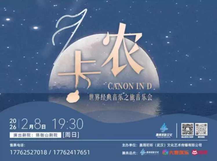 "Canon in D" World Classic Music Journey Concert Date: Sunday, Feb. 8, 2026, 19:30 Venue: Luojia Mountain Theatre | Wuhan City Ticket Prices: 100 CNY, 180 CNY,280 CNY, 380 CNY