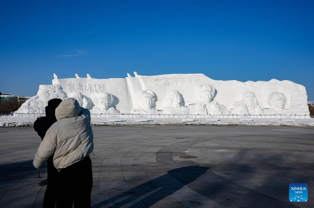 Tourists view a snow sculpture in Changchun, northeast China's Jilin Province, Jan. 5, 2026. Changchun has set up a variety of distinctive ice and snow landscapes throughout urban areas this winter to lure tourists and encourage consumption. (Xinhua/Yan Linyun)