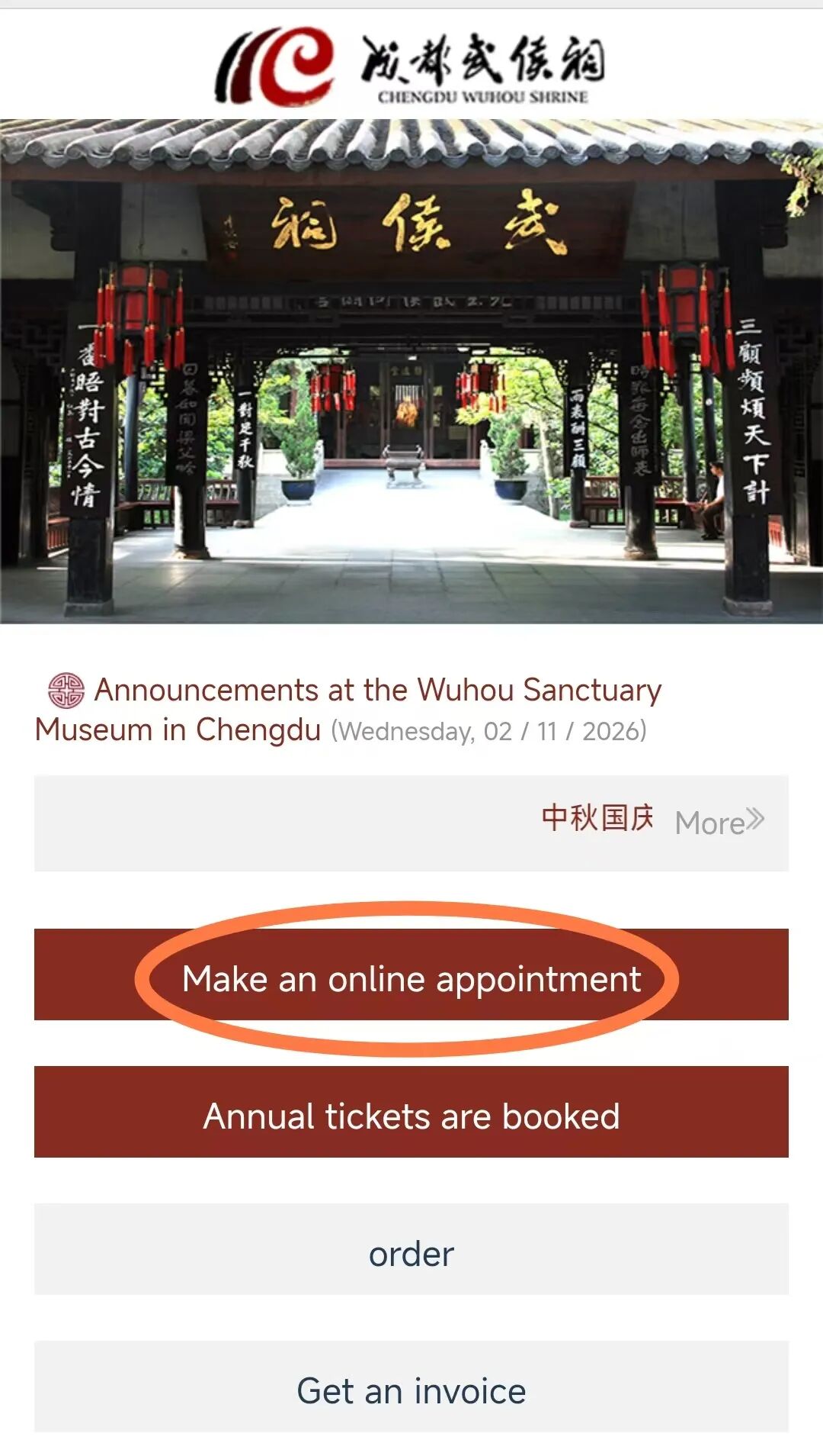 Tickets can be booked through the WeChat Official Account of Chengdu Wuhou Shrine Museum. Visitors should provide accurate personal information for the ticket booking. Entry will be denied if the information does not match the ID document.